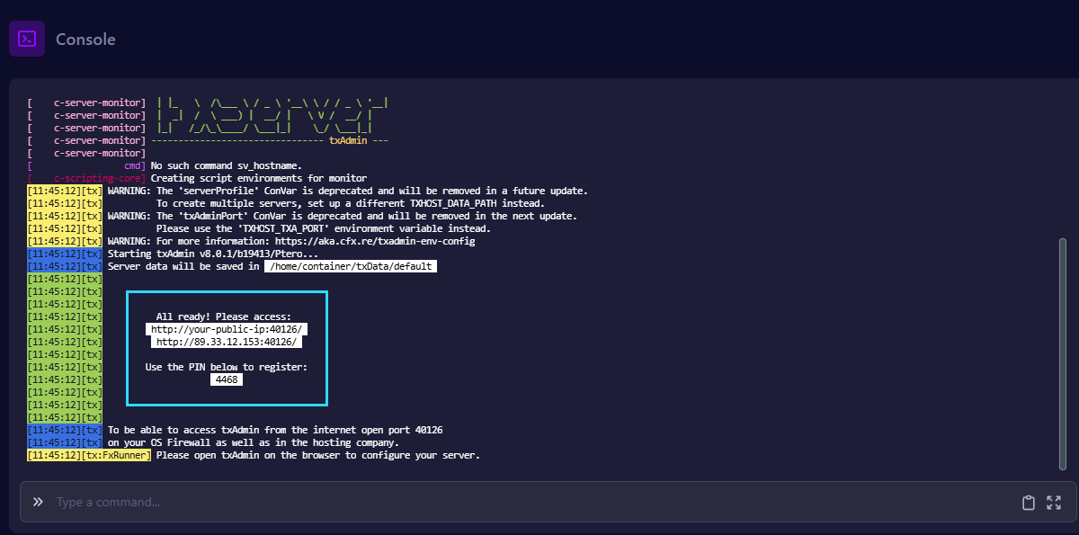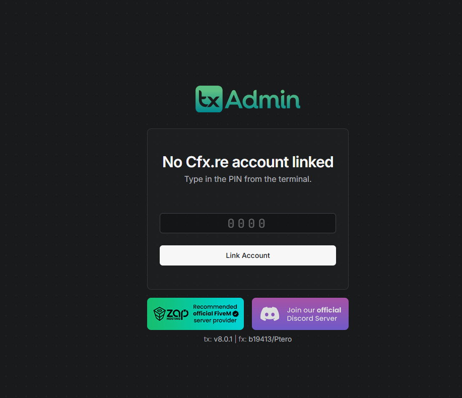 You have 2 options. Click on the http://89 link in the console or press the tx admin button located next to the power buttons. After clicking one of those you will see this page.
